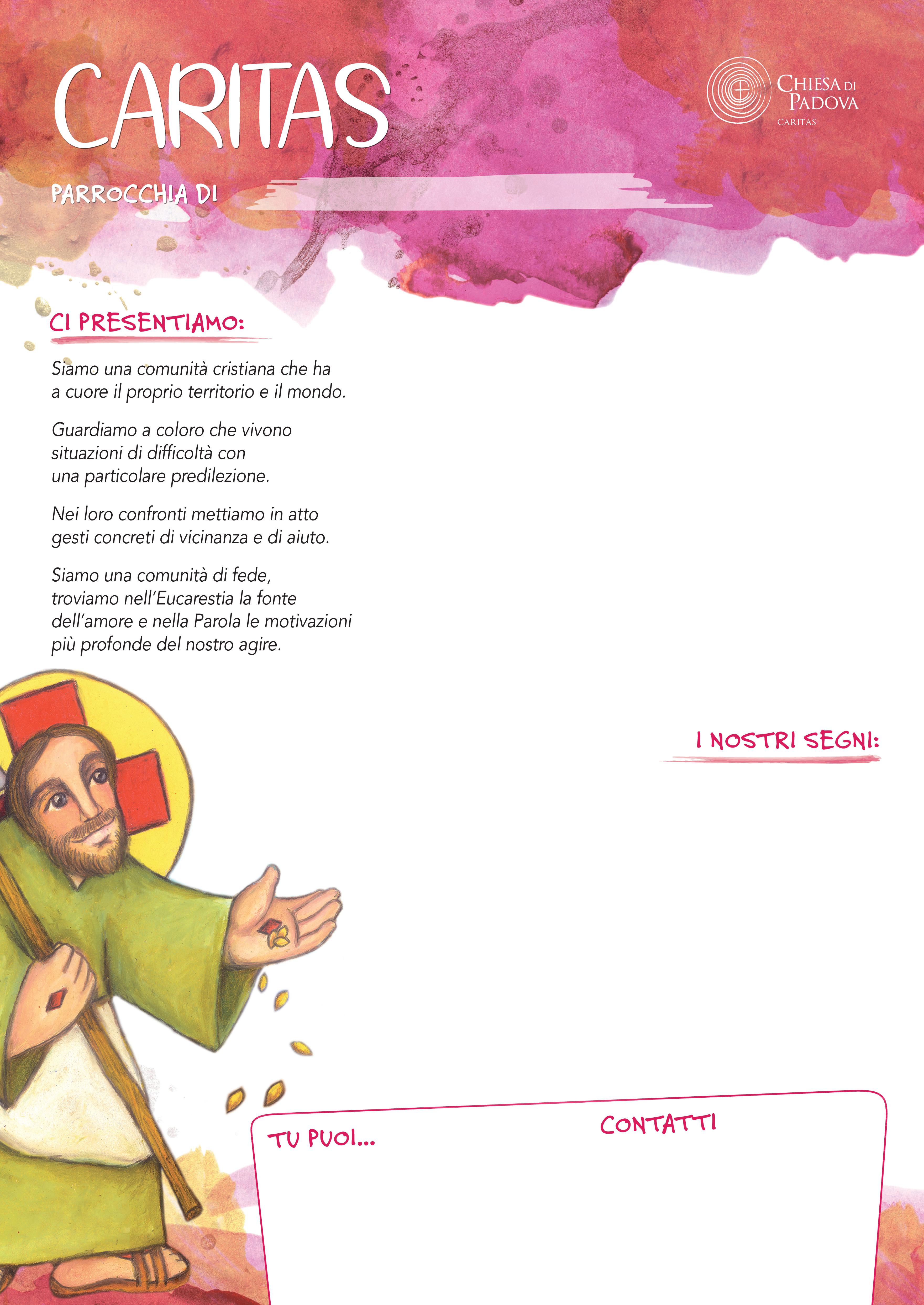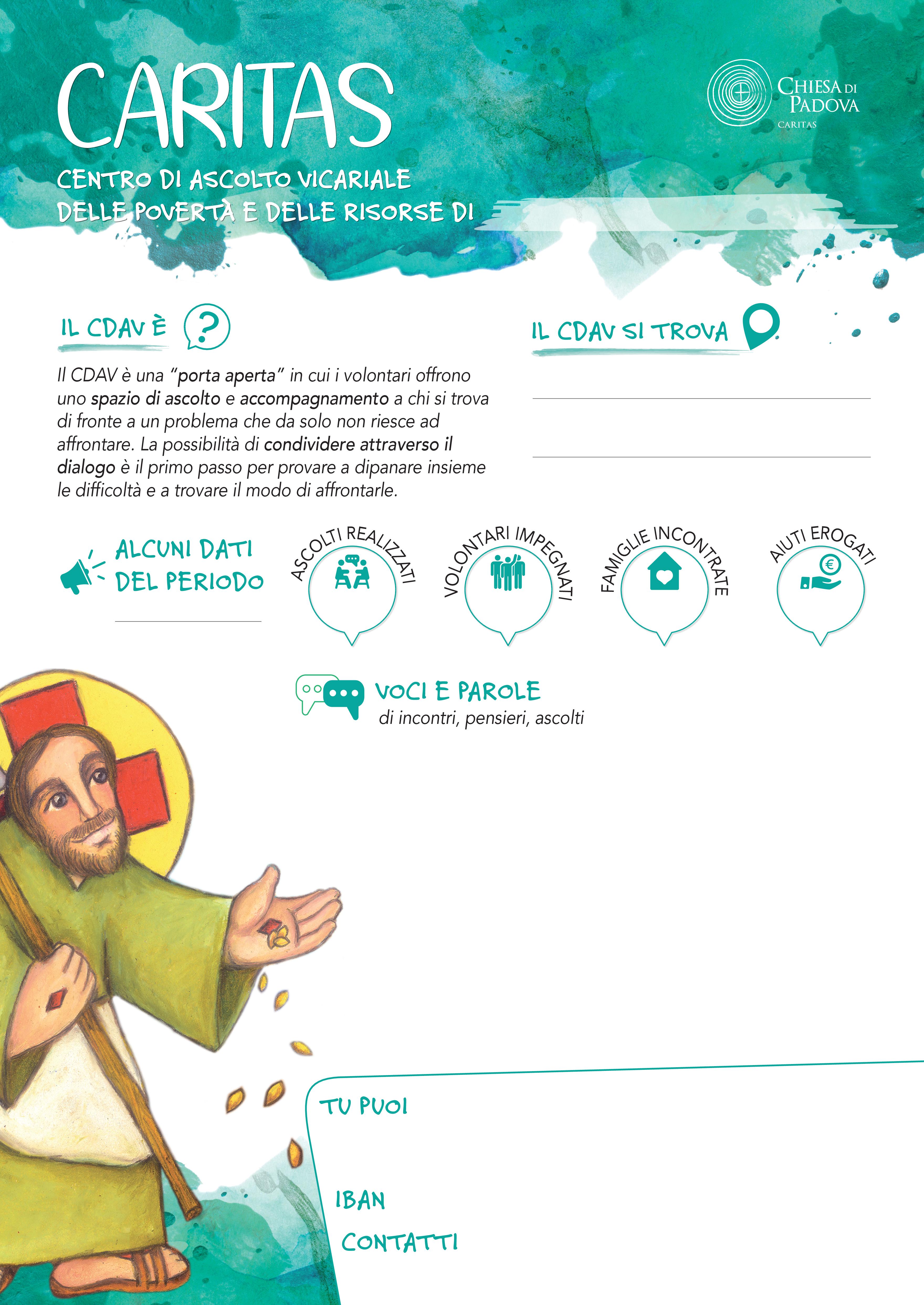 Un pieghevole da personalizzare (formato A4 orizzontale) per raccontare le attività della Caritas parrocchiale e del Centro di Ascolto vicariale delle povertà e delle risorse (CDAVx). Da distribuire con il bollettino parrocchiale, in occasione della domenica della Carità, al CPP, …