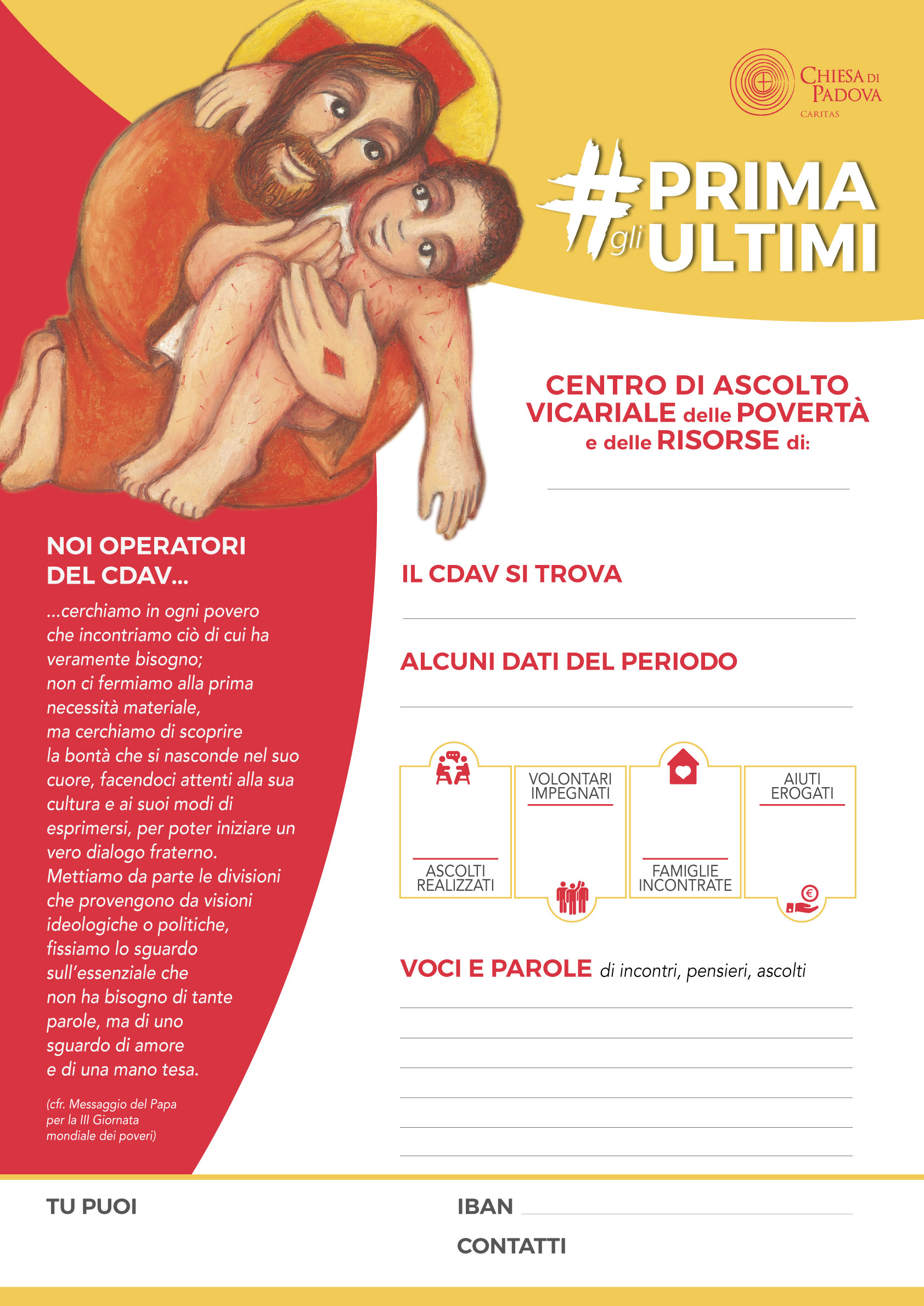 Un pieghevole da personalizzare (formato A4 orizzontale) per raccontare le attività della Caritas parrocchiale e del Centro di Ascolto vicariale delle povertà e delle risorse (CDAVx). Da distribuire con il bollettino parrocchiale, in occasione della domenica della Carità.